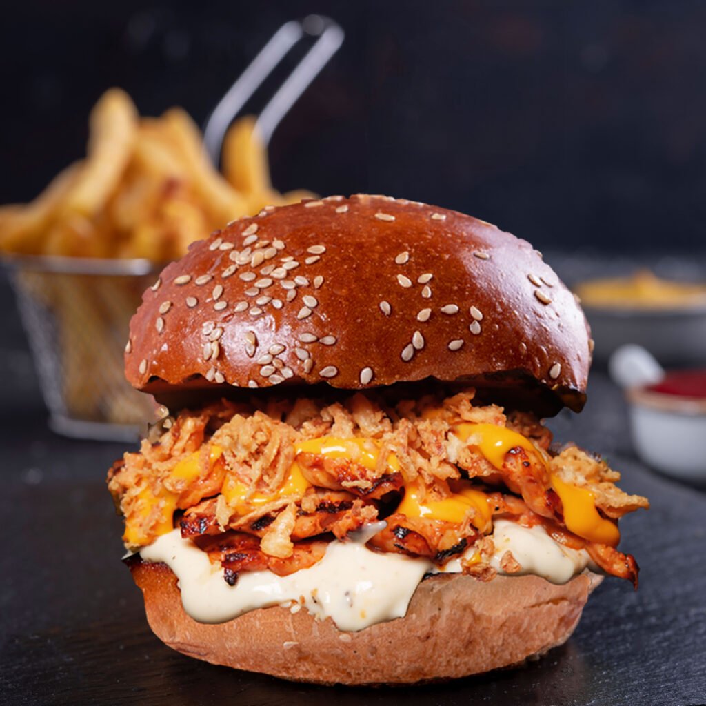 Trüf Mayonezli Chicken Burger (Yeni) İçindekiler:Özel Soslar ile Marine Edilmiş Izgara Tavuk, Trüflü Mayonez, Çıtır Soğan Parçacıkları, Cheddar Peyniri ve Patates Kızartması ile. Fiyat:120gr 309₺, 180gr 379₺
