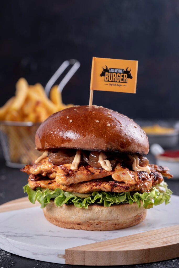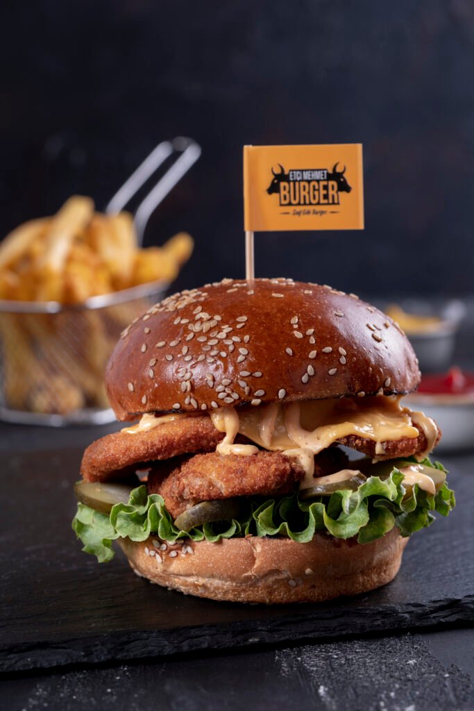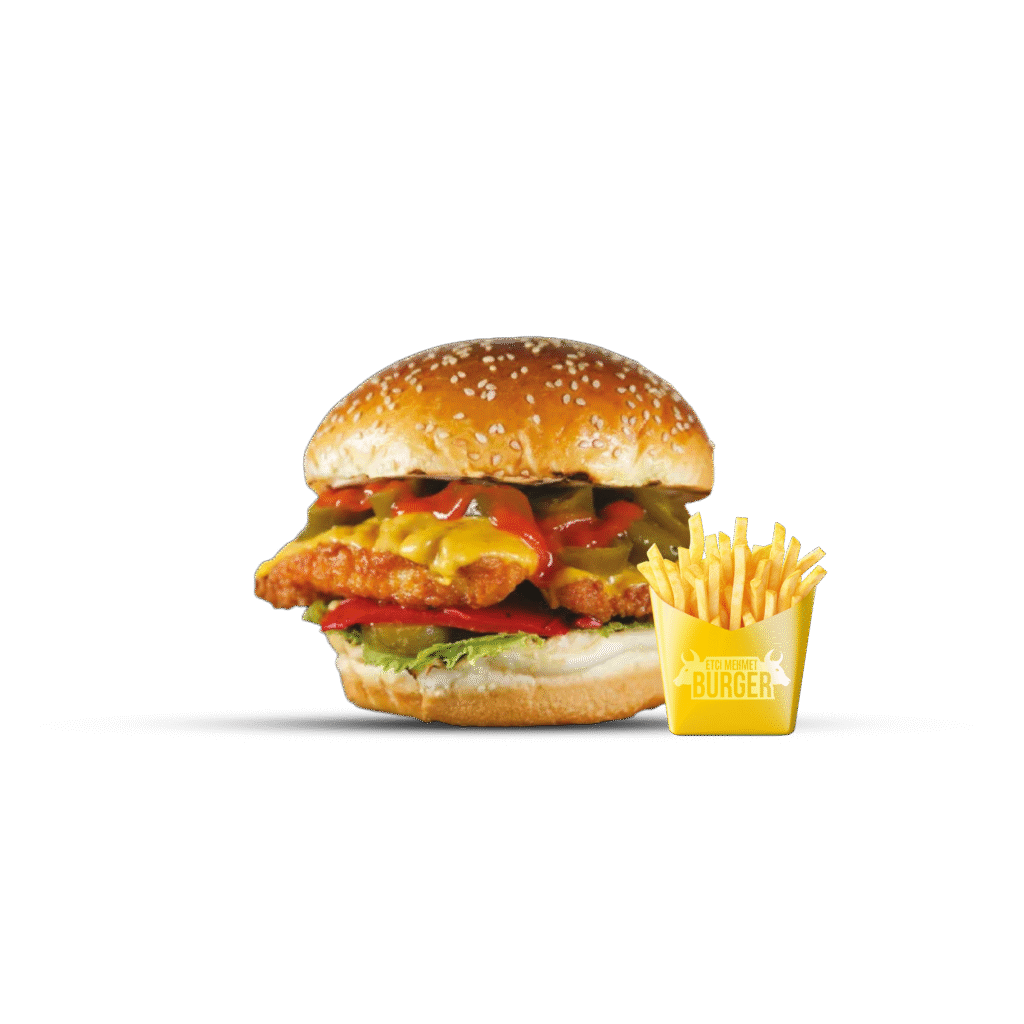 Çıtır Chicken Burger İçindekiler:Özel Paneli Çıtır Tavuk, Cheddar Peyniri, Kuru Soğan, Turşu, Yeşillik, Etçi Mehmet Özel SOS ve Patates Kızartması ile Fiyat:120gr 299₺, 180gr 369₺
