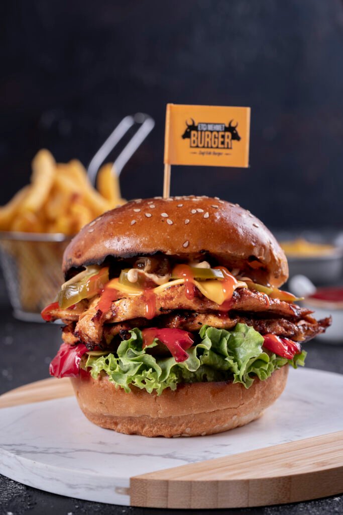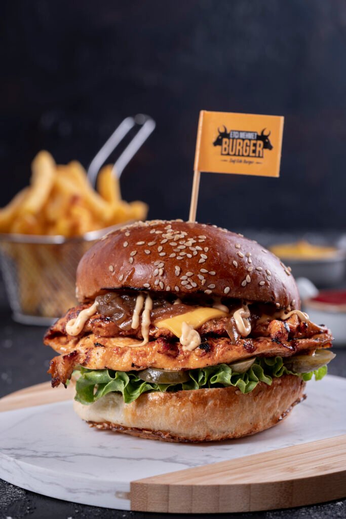 Acılı Chicken Burger İçindekiler:Özel soslar ile marine edilmiş izgara tavuk, Jalapeno biber, Közlenmiş kırmızı biber, cheddar peyniri, karamelize soğan, turşu,yeşillik,acı sos ve patates kızartması ile. Fiyat:120gr 299₺, 180gr 369₺