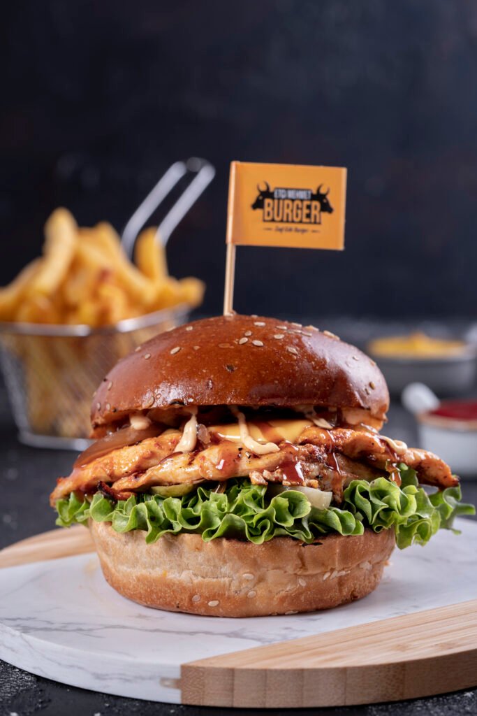 BBQ Chicken Burger İçindekiler:Özel soslar ile marine edilmiş izgara tavuk, barbekü sos, cheddar peyniri, karamelize soğan, turşu,yeşillik, ve patates kızartması ile. Fiyat:120gr 284₺, 180gr 354₺