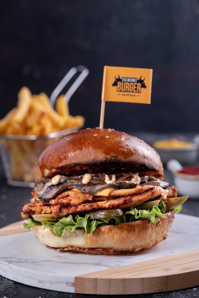 Mushroom Chicken Burger İçindekiler:Özel soslar ile marine edilmiş izgara tavuk, kremalı mantar, cheddar peyniri, karamelize soğan, turşu,yeşillik, ve patates kızartması ile. Fiyat:120gr 299₺, 180gr 369₺