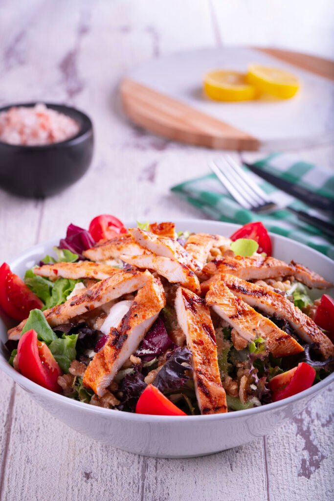 Chicken Grill Salata İçindekiler:Akdeniz yeşillikleri üzerine ızgara tavuk parçaları, tulum peyniri, ceviz, kuru üzüm,çeri domates, limon ve zeytin yağı Fiyat:319₺