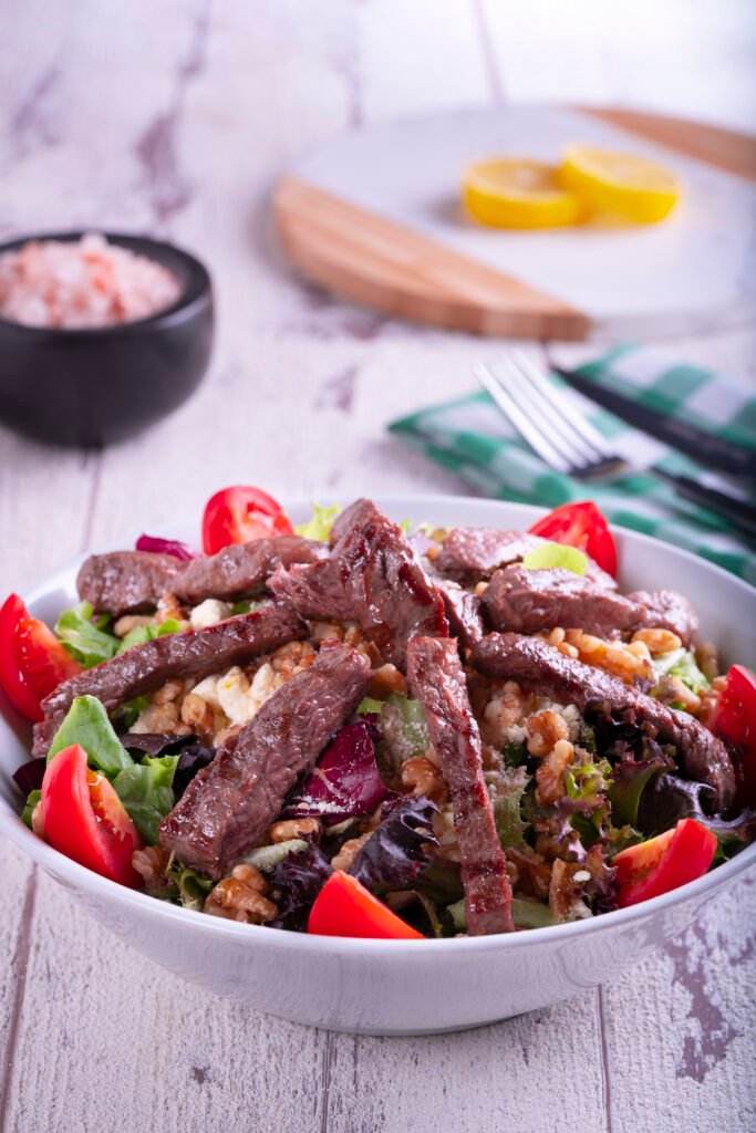 Beef Salata İçindekiler:Akdeniz yeşillikleri üzerine ızgara bonfile parçaları,tulum peyniri, ceviz, kuru üzüm,çeri domates, limon ve zeytin yağı. Fiyat:489₺