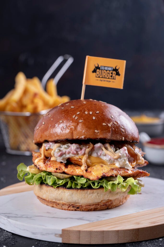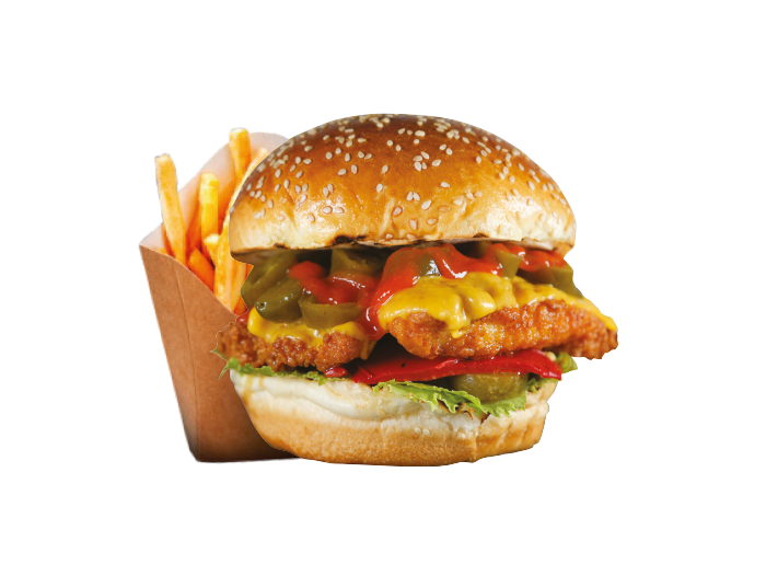 Acılı Chicken Burger İçindekiler:Özel soslar ile marine edilmiş izgara tavuk, Jalapeno biber, Közlenmiş kırmızı biber, peynir, karamelize soğan, turşu,yeşillik,acı sos ve patates kızartması ile. Fiyat:120gr 329₺, 180gr 399₺