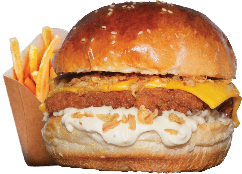 Trüf Mayonezli Çıtır Chicken Burger İçindekiler:Özel Paneli Çıtır Tavuk, Peynir, Trüflü Mayonez, Çıtır Soğan Parçacıkları ve Patates Kızartması ile Fiyat:120gr 349₺, 180gr 419₺
