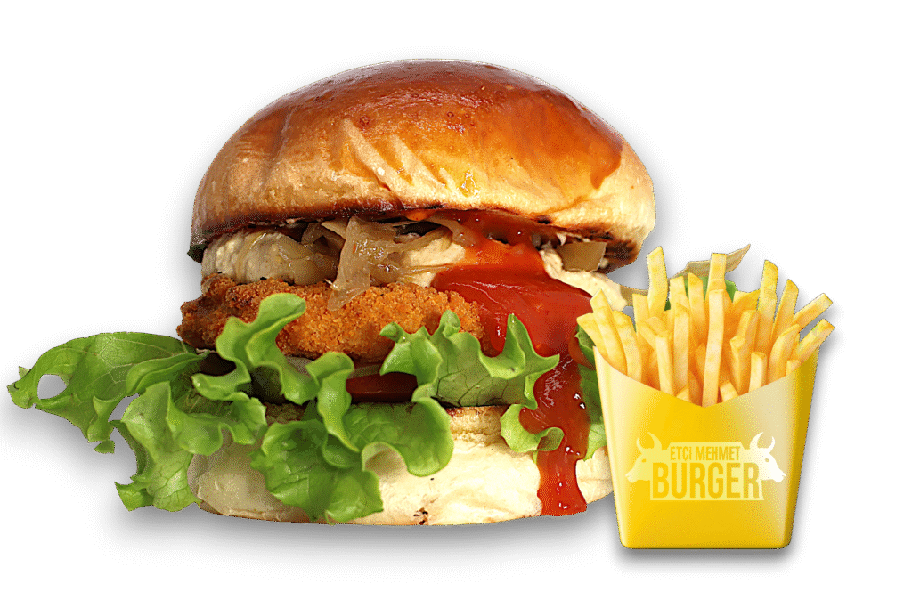 Tavuk Vegan Burger İçindekiler:Özel vegan pane, humus, domates, karamelize soğan, turşu, yeşillik ve yanında baharatlı patates kızartması ile. Fiyat:100gr 285₺