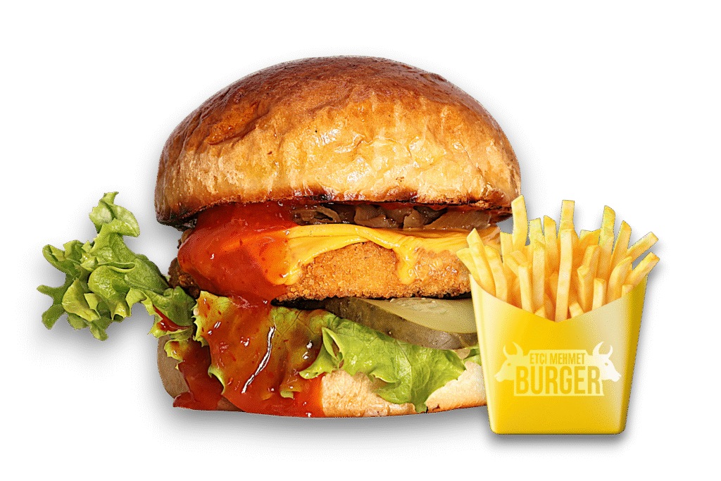 Tavuk Vegi Burger İçindekiler:Özel vegan pane, cheddar peyniri, karamelize soğan, turşu, yeşillik, burger sosu ve baharatlı patates kızartması ile. Fiyat:100gr 270₺