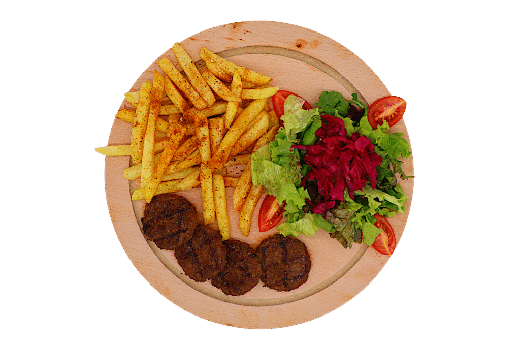 Vegan Izgara Köfte İçindekiler:Özel ızgara vegan köfte, yanında taze Akdeniz salatası ve baharatlı patates kızartması ile. Fiyat:290₺