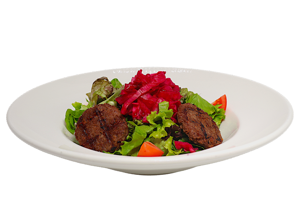 Vegan Köfteli Akdeniz Salata İçindekiler:Taze Akdeniz yeşillikleri üzerinde ızgara vegan köfte parçaları; kırmızı lahana turşusu ve çeri domates eşliğinde. Fiyat:330₺